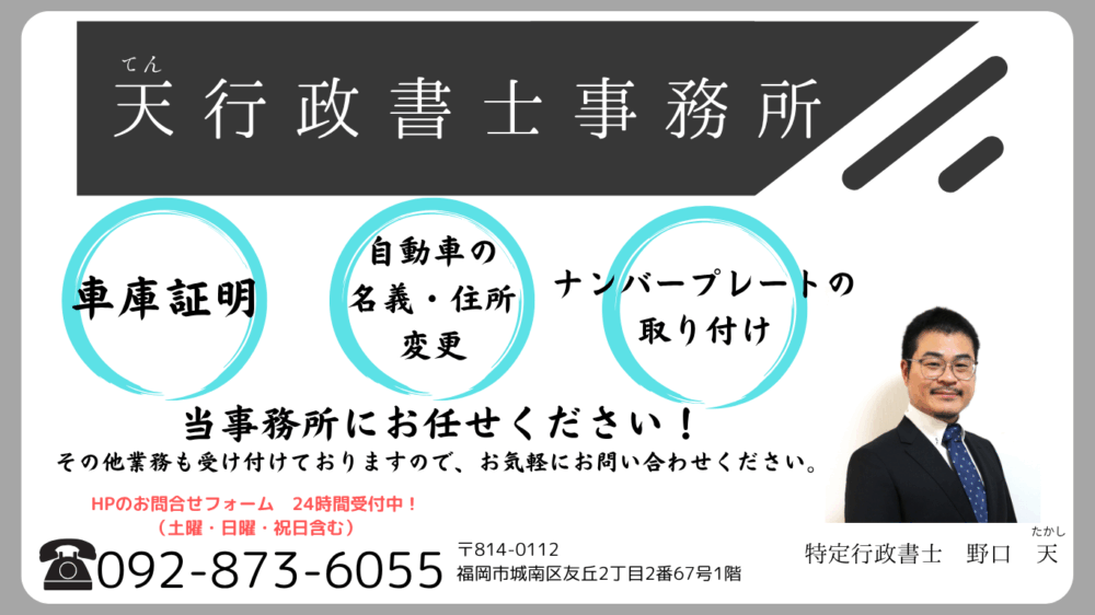 🚗自動車の運転が好きな行政書士です🚙 お車の車庫証明、名義変更、住所変更、ナンバープレートの取り付けを主におこなっております。 福岡全域に対応しております。 ご相談は無料なのでお気軽にお問い合わせください。