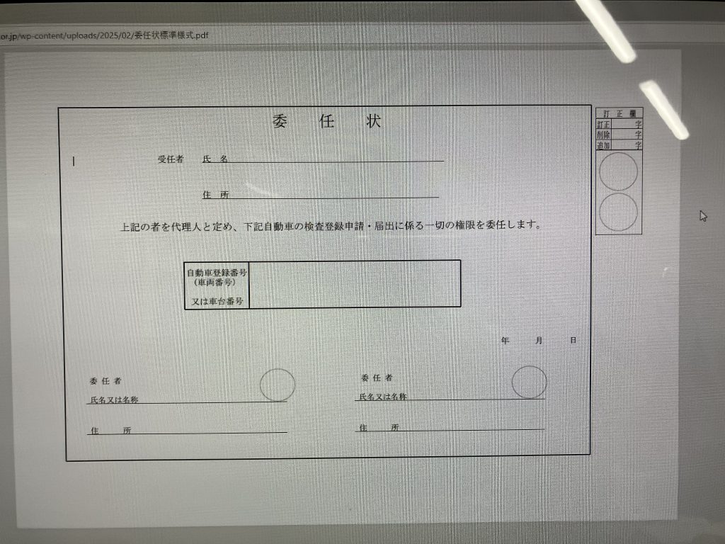 ●委任状(自動車) 2025年2月12日 カテゴリー: 天行政書士事務所,車関係 Takasi.Noguchi 車の名義変更などに私達、行政書士に依頼する時に必要な書類の一つに委任状があります。 そんな委任状のお手本の様式が発表されました。 これじゃなくても必要事項が書かれてあれば大丈夫なので使用するかは各自の判断ですね。 当事務所はこれにします(^^♪